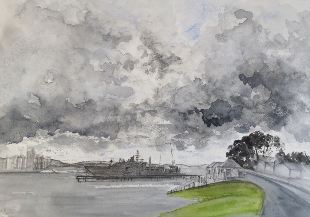 While walking, on the lookout for something I could sketch, I looked no further than the sky. It was both fantastic and rather terrifying, as the brooding clouds looked ready to empty their heavy load on me. So, before the anticipated deluge I took a photo, and continued on my walk, expecting to find myself racing for cover at any moment. Weirdly, those clouds kept on brooding and finally wreaked havoc in the middle of the night. Wind thrashed the trees, streets, and whipped up the sea, but our region was relatively unscathed, fortunately. Not so, further out west where floods drowned cars and wrecked homes and businesses.