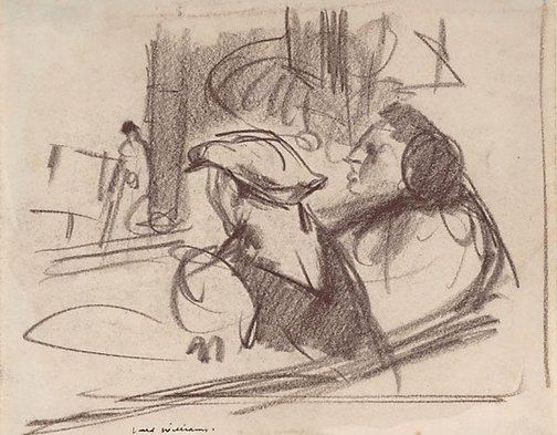 The works in the exhibition I went to are from the time he studied in London during the 1950s. These works blew me away. There were more than 50 drawings and sketches. Most sketches were executed in conté crayon, using orange and black in the main, but some had a light grey wash in parts. Unfortunately I can show only a few of the images I saw (I had assumed Kerry was taking photos) and could not locate more for this post as I’d hoped. I did however find one of the period executed in black conté, which is typical of the style of many in the exhibition; gestural and loose, yet accurate. He captured the shape of people, scenes and animals with deft, fleeting strokes, that showed his skill in bucketloads. You can view more in a review put out by The Conversation. Do take a look. I am kicking myself for not purchasing the exhibition catalogue. I may yet order it.