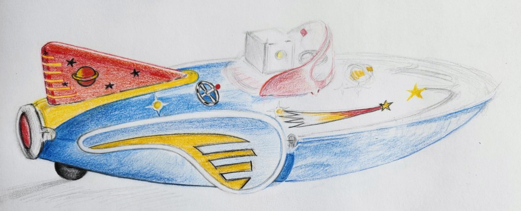 A few weeks back I posted about my husband Kerry’s special birthday (80th). He received wine, chocolate and song at his party, but when he opened a box-shaped present later that evening he was amazed. For on the wrapping paper sat the most unique, but perfectly delightful gift. Some of you may have heard of, or even owned a tin SPACE PATROL vehicle with Da Da Sound. This model is circa 1970’s and from China, although there were earlier Japanese models through the 1950s and sixties. But neither Kerry and I had come across this toy in our childhood, or vroomed one around a room. I know I was was overjoyed to see the Space Patrol toy, brightly coloured with stars and flashes and a ‘robot’ driver. I immediately planned to sketch this fabulous machine, and finally found the time to spend on it yesterday.