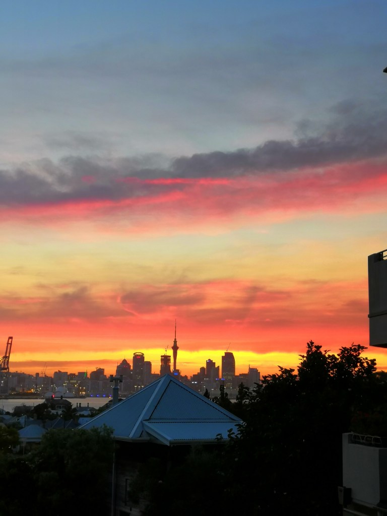 Just two nights back, this was the view from our windows which look onto the sea, Auckland’s CBD and further west, where sunsets like to glow and sink into night. But before they do, they offer some stunning colour arrays, which have me squealing to Kerry, ‘Look at the sky, look at the sky!’ And he often follows me onto the patio to take photos. But this one, on the 28 December – WOW!