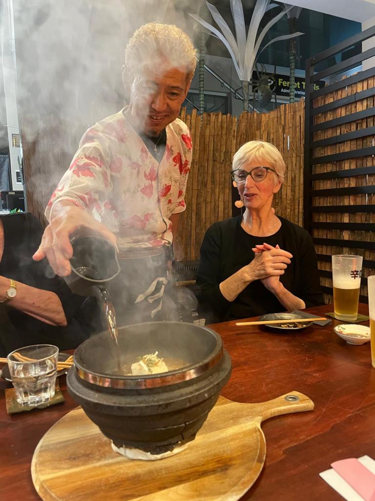 I don’t wish you to think I do nothing but write, and go on about this book, because I do get out and have fun in different ways. We have a Japanese restaurant Danryu down the road, and hearing its good reputation booked in with some friends. It wasn’t just good, it was stupendously good, and the host/chef a character and his wife delightful. So why not post this great image of my expression as chef presents the table with a bowl of agedashi tofu (silken tofu with sweetened sauce) heated in the most theatrical way.