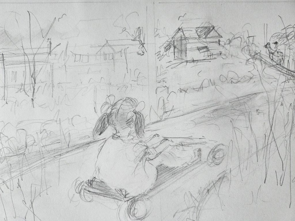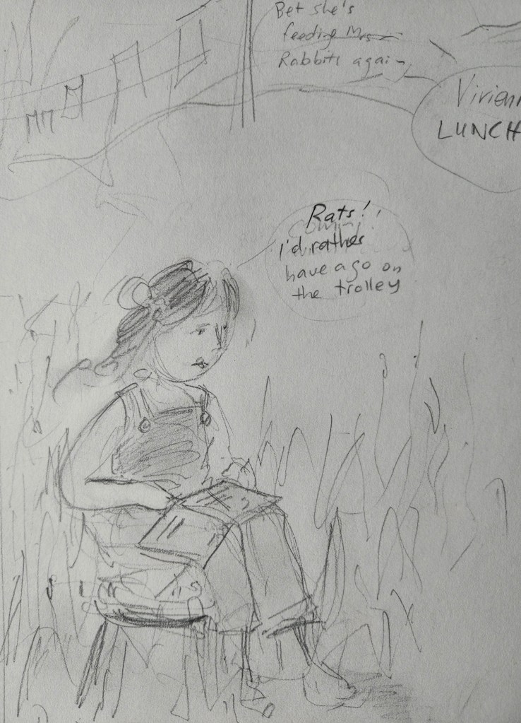 You may have thought I’d never get going on this idea of a memoir of me as a youngster. True, I didn’t get far, but there were other things I had to do. But now I have looked through my initial rough sketches, and have decided to show them to you, I feel it is a small start. My plan, from here on in, is to complete a couple of images in colour on good paper, using watercolour and pencil, as a trial for the finished product. Today however, it’s just more pencil roughs. Except for the photo of me, left, taken on a Brownie camera in the 1950’s. Yes, I’m that old.