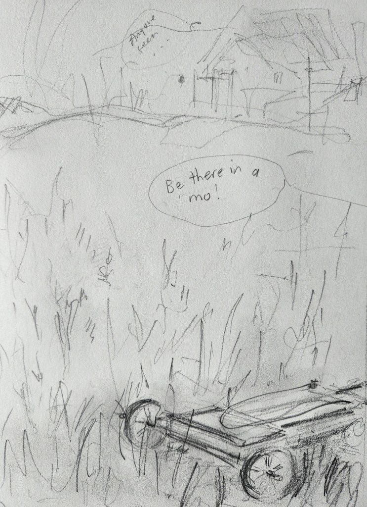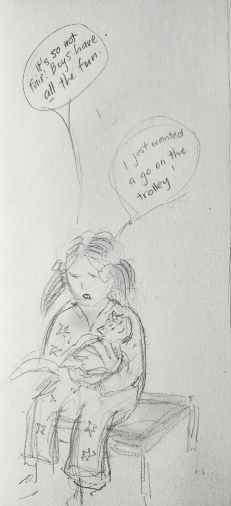 I guess I can let you have a spoiler or two. The first pages begin with my wishing I was allowed to have a go on my brothers’ homemade trolley …