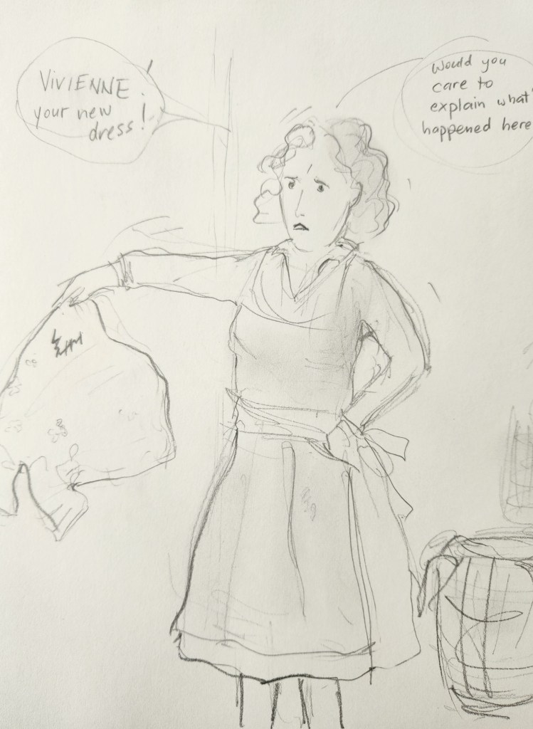 I got my chance when no one was around and Wheee! Until I got my dress stuck in the axle. I sneaked inside, changed my clothes, grabbed a needle and cotton and stitched the rip, then…