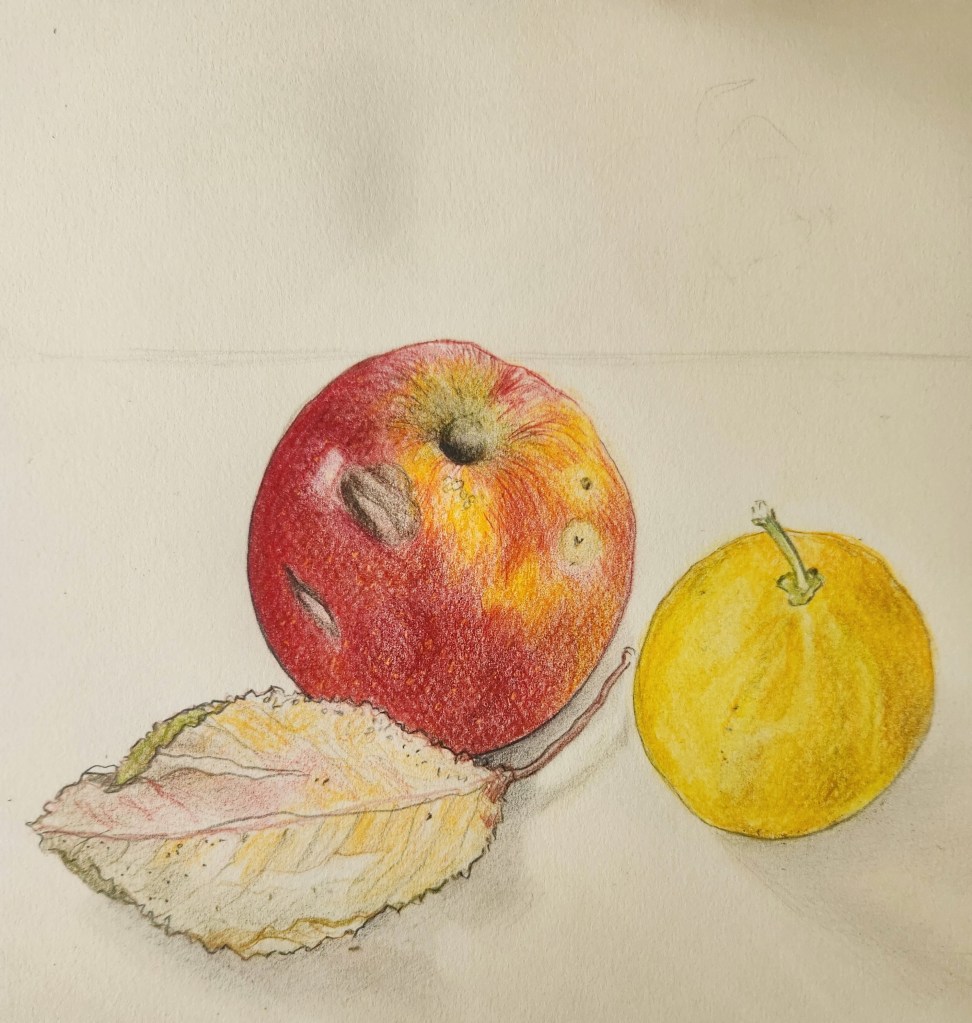 I placed the mouldering apple and limp lemon on my desk and thought the arrangement needed something else. Ah ha! I hadn’t walked far from home when I spotted a leaf reflecting similar colours to the apple. Right, I was onto it, or almost, for by the time I finally got my gear out, I needed the light on. Good excuse to leave it until the morning. Except … The leaf that I had sketched in outline yesterday was a withered memory of its former self by the time I was ready to draw this morning. Never mind, I thought, deciding to finish off the apple and lemon and leave the leaf unfinished.