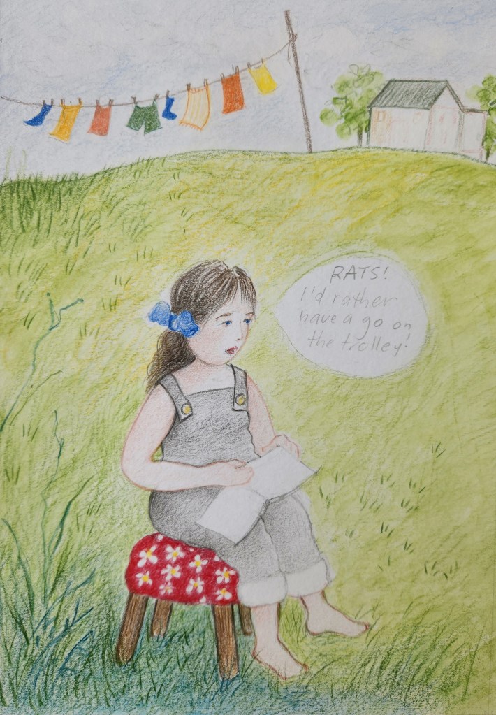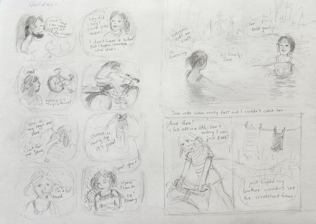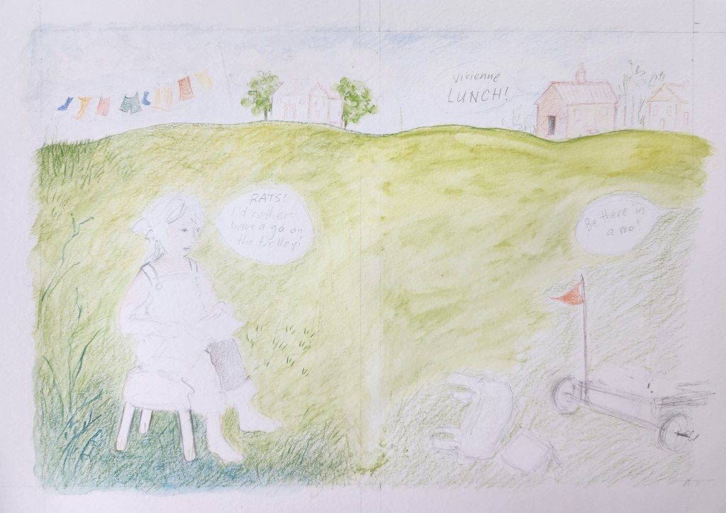 Some lovely work. These are all your memories; just let the pencil take it’s course. One idea will lead to another and before you realise a story will develop. Did your brother see the scratched frame? There is a story there. Good luck with Vivienne’s adventures.