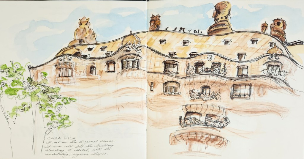 We sat on a corner diagonal from this ornate building, Casa Mila. I sat looking at the structure for ages, wondering where I should start. There was so much detail one could have focussed on, so I decided to try and capture the feel of essence of movement the building possesses and keep it simple. Everyone produced terrific sketches. And, I was rather pleased with mine too. It was more of Gaudi the following day. But I had no complaints about that!