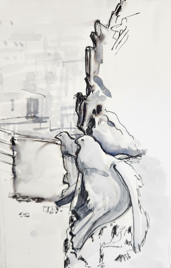 I was high in a tower which overlooked the city and focussed on the sculptured doves in front of me. I used water-soluble ink for the foreground. It’s wise not to load the brush with too much water when you pick up the ink pigment. I used a diluted watercolour for the background.
