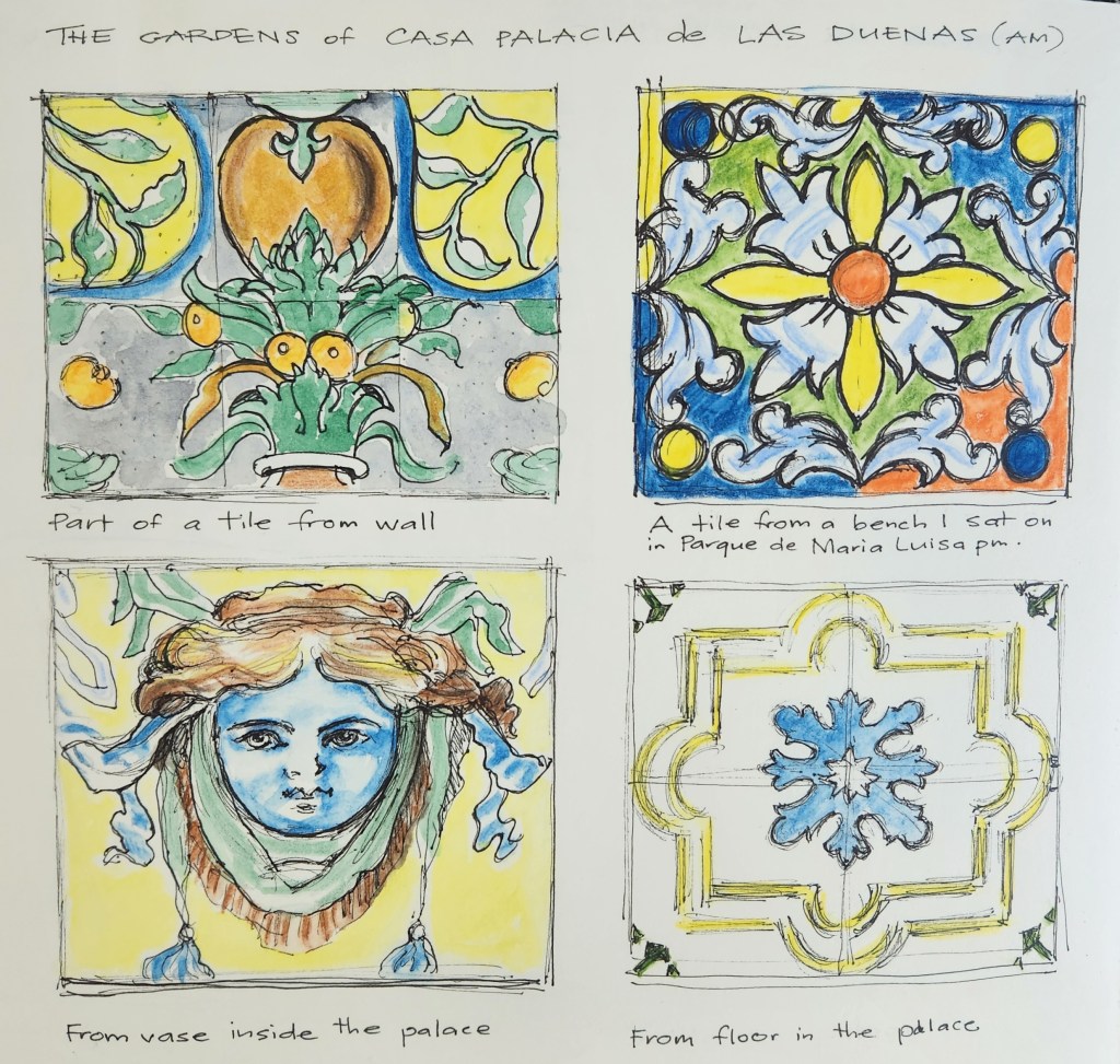 And now, Seville. One morning we wandered around the amazing Casa Palacia de Las Duendas, which was filled with a fabulous array of paintings and colourful tiles, some of which I selected to draw.