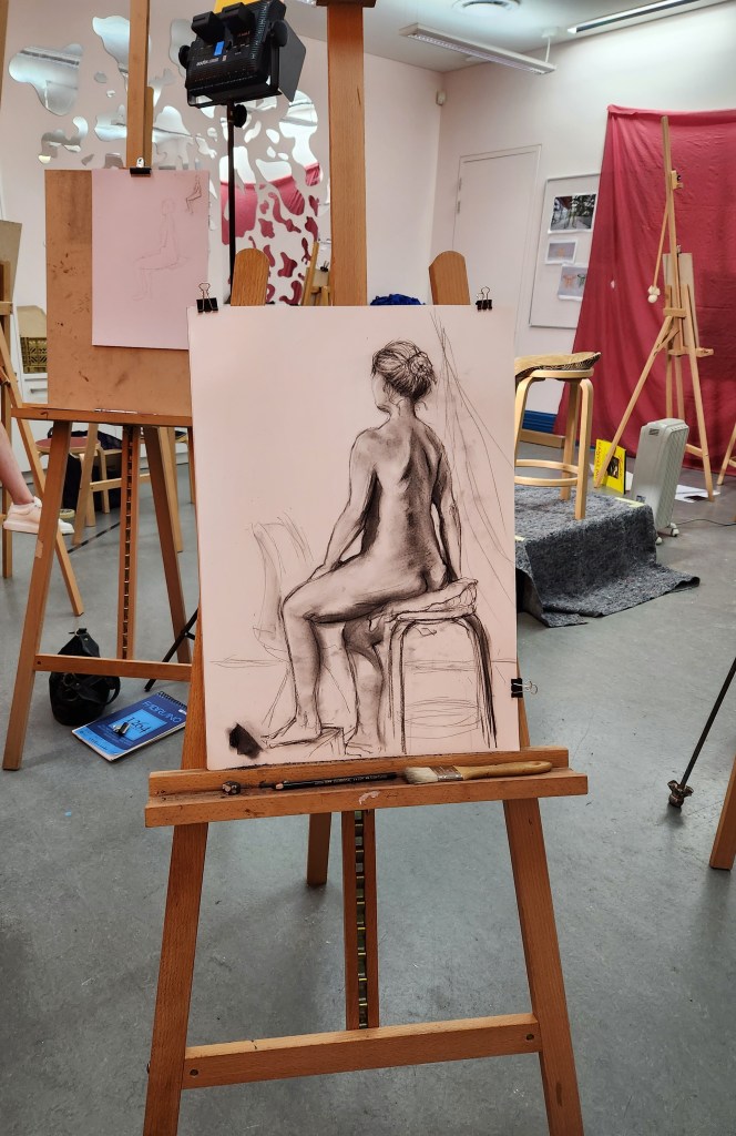 Week Three. In this session we were to work on A2 paper, using pencil or charcoal for our preparatory sketch. No photocopies this week. The model Lulu is similar in build to the figure we had copied in Goldie’s work – the idea being, we were told, was to execute a painting in tones similar to the one we had copied. But first, the pose needed working out, and so a few minutes were spent moving a stool, arranging a cushion, and having the light in an appropriate position to suit both the model and the class. We would be working with this same pose for three weeks. Hard on the model I thought.