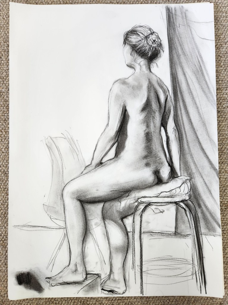 Continuing on from last week, when I showed you the charcoal sketch (see above) which I would be transposing onto an A2canvas. As I am going to take you through that process I thought it would help to include it here as this is the pose I shall continue to work from.